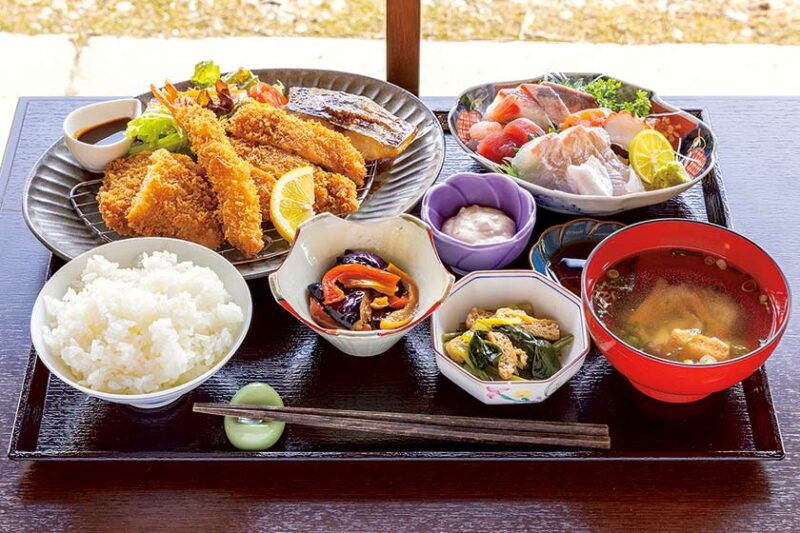 5種以上の刺身と焼き魚、揚げ物が贅沢にのった「うお座御膳」税込2,500円で、海の恵みを味わって。