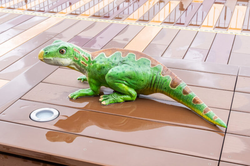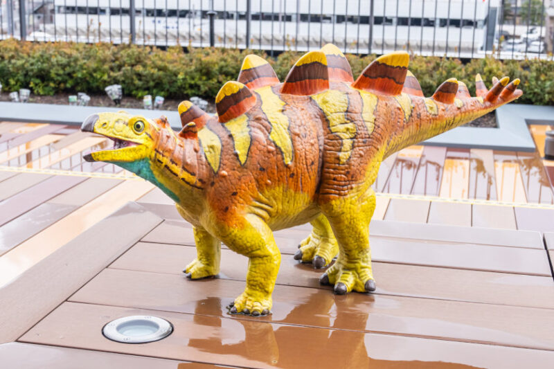 屋上ベンチには、小さくて可愛い子どもの恐竜がいっぱいです。