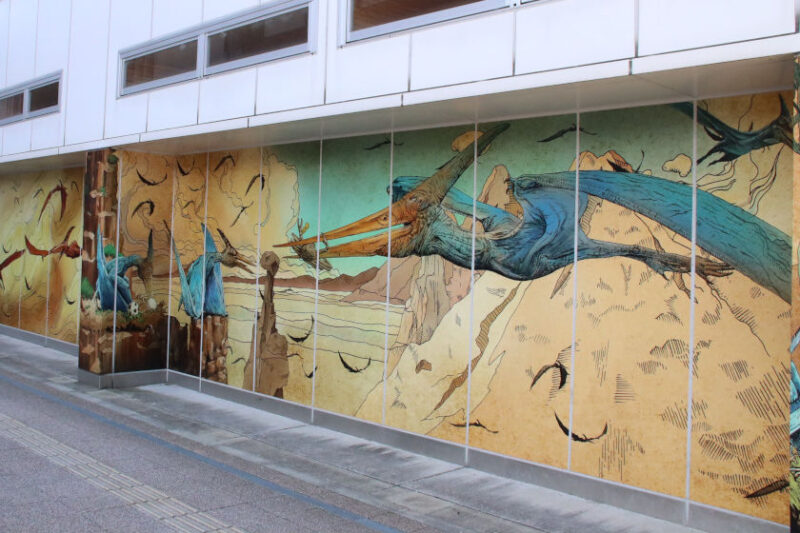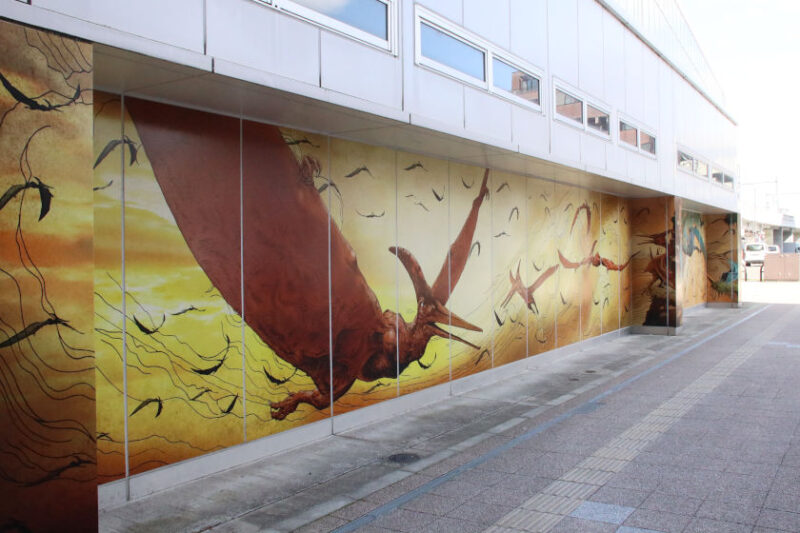 えちぜん鉄道福井駅の駅舎壁面で見ることができるのが翼竜「プテラノドン」を描いた全長20メートルもの壁画。