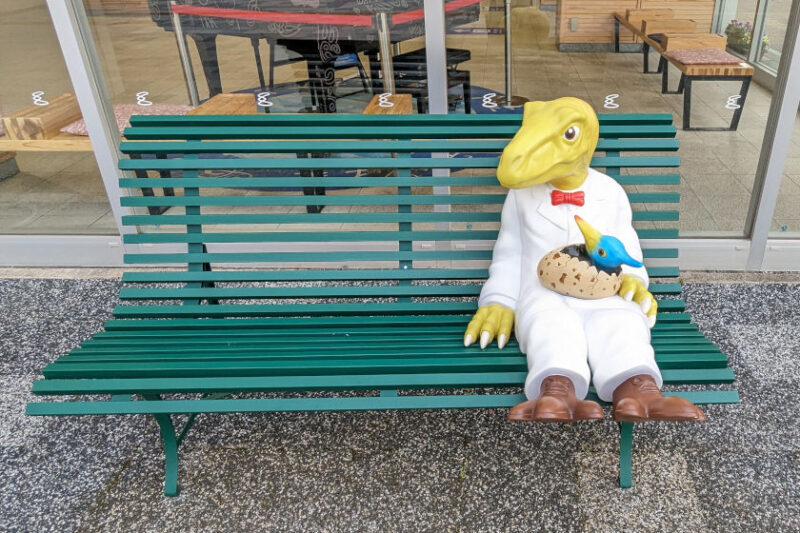 また、駅舎の中には大人の恐竜博士のベンチがあり、正面入口には恐竜博士を夢見る子ども恐竜がベンチに座っています。