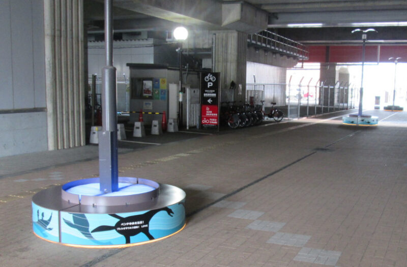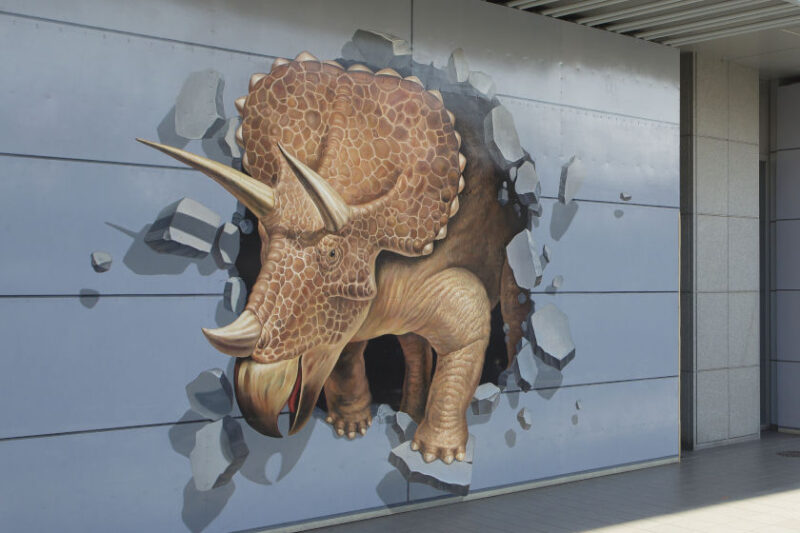 駅舎の壁面の一部には、横約7.3m、縦約4.6mの恐竜が飛び出して見えるトリックアートパネルが2面設置されています。