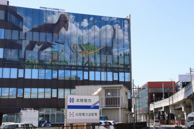 福井駅西口の壁面には、横約45m、縦約10mの巨大な恐竜イラストがラッピングされています。