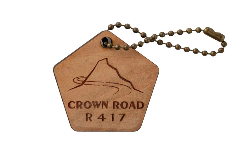 「冠山峠道路(クラウンロード)」開通を記念したチャームで、池田町の木工体験施設「ウッドラボいけだ」で制作。