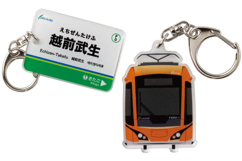車両がデザインされた缶バッジや駅名標のキーホルダーなど「福井鉄道」オリジナルグッズが揃います。