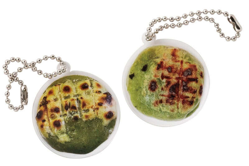 勝山市民のソウルフードで、ヨモギ餅で粒あんを包んだ「勝ち山おやき」がキーホルダーに。
