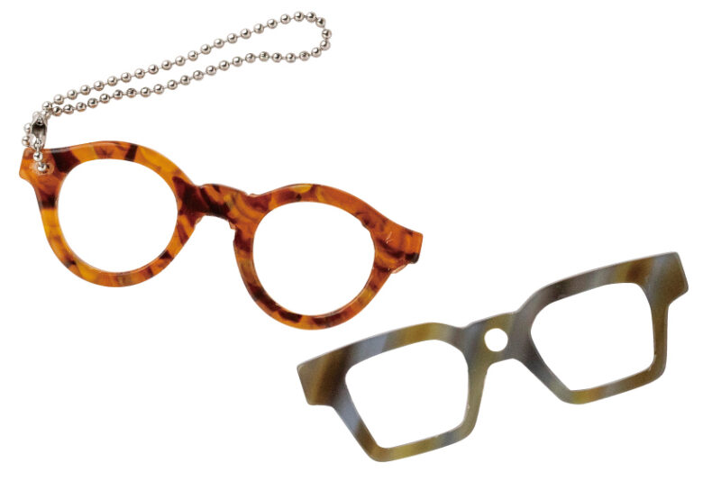 眼鏡の素材アセテートを使用し、ボストン型やスクエア型などフレームの形やデザインは、何が出るかお楽しみ。