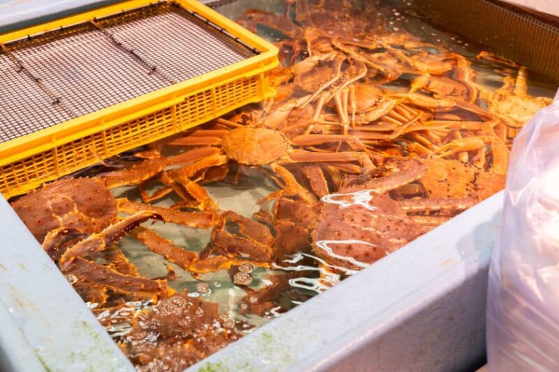 生のカニはもちろん、ボイルしたカニなども並びます。市場ならではのリーズナブルな価格でお買い物できますよ。